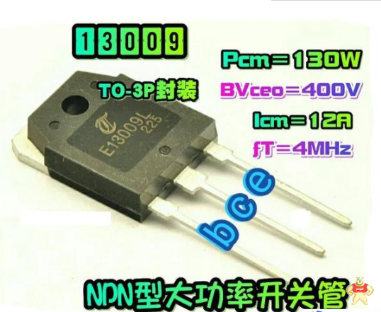 高反压电源开关管,和节能灯常用的13001,13003,13005,电脑电源用的13007属同一系列的开关管,别的参数基本相同,就是功率,电流不一样,13009在450瓦以上的电脑电源中也常见,最大电流Icm为12A。
